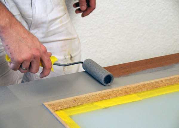 - Нанесите на поверхность слой краски. Это делается либо с помощью велюрового валика, либо посредством использования краскопульта.