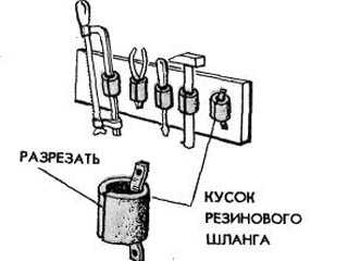 Материал – доска, фанера. Скобы под крупный инструмент (голубые) – из проволоки или просто вбитых не до конца и загнутых гвоздей. Петли под мелкий – кожаные или брезентовые. Есть совсем простая любительская модификация из обрезка доски и кусков дюритового шланга, см. след. рис. справа.