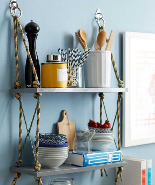 Заполните пустую стену системой полок, которые прикреплены веревками. Система может гармонировать и создавать чудесную кухню, где вы храните некоторые предметы в комнате, также можете поместить в гостиной или в шкафу.