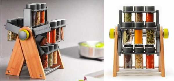 Следующий пример удачного использования законов физики для повышения комфортабельности при создании вкуснейших блюд выполнен из пластика и древесины. Принцип работы этого кухонного экземпляра для приправ аналогичен предыдущему, но дизайн имеет существенные отличия. Деревянные ножки, имеющие простую конструкцию, удерживают емкости для пряностей. Это функциональное приспособление похоже на мельницу. Несмотря на большую вместимость, займет совсем немного места на вашей кухне.