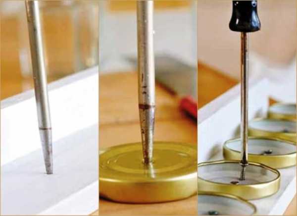 - По центру каждой крышки просверлите отверстия для двух винтов (расстояние между отверстиями 2 см). Если сделать крепеж только для одного винта, при закручивании-откручивании банка будет проворачиваться.