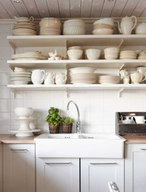 Открытые полки сейчас стали одним из доступных, практичных и стильных дизайнерских решений. Такие конструкции замечательно вписываются в кухонный интерьер, особенно выполненный в стиле прованс. Также они отлично подходят стилям кантри, деревенскому и скандинавскому. Весьма эффектно открытые полки выглядят в кухнях, которые оформлены в стиле минимализма, а также в обычной классике.