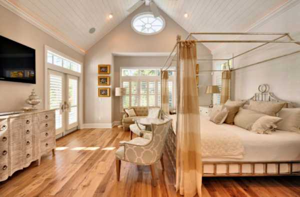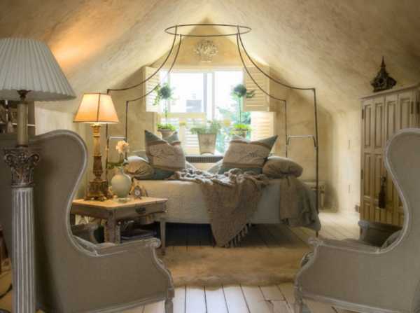 Балдахин-парус можно создать в дачных домах или на балконах. Нередко там используются деревянные потолки. К ним прибивается ткань. Это один из самых простых и самых дешевых способов. Особенно эффектно будет смотреться, если Ваша кровать находится на чердаке, ведь они имеют скатную форму.