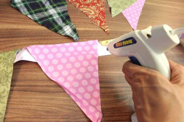 5. Чтобы скрыть сам круг, украсьте верх балдахина снаружи, например, самодельной гирляндой из флажков. Для ее создания на ленту наклеиваем клеем для ткани, горячим клеем или пришиваем треугольные или прямоугольные флажки с небольшим отступом друг от друга. Гирлянда должна получиться достаточно длинной, чтобы полностью обмотать ею верхнюю основу балдахина 1-2 раза или 1 раз и потом пустить ее вниз по диагонали. Треугольные флажки просто вырезайте из ткани и клейте, подбивать край у них не нужно: вид некоей творческой небрежности только добавит навесу очарования.