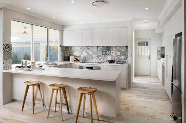 В этом варианте кухни с полуостровом, решили сделать кухню без верхних шкафов. Оставить шкафы только внизу. Обратите внимание, как интересно поработали с фартуком. Разграничили на две зоны, варочную и зону мойки. И в каждой зоне, выложили разную плитку.