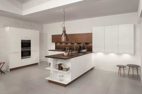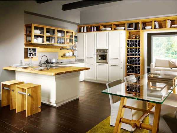 Среди недостатков подобного гарнитура называют ограниченный проход, ведь подойти к нему можно лишь с трех сторон. Хотя в действительности эту стену можно оборудовать дополнительными полками – например, открытые шкафы можно использовать для хранения декоративных тарелок, бокалов, специй и многого другого.