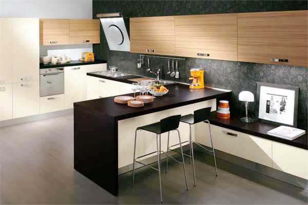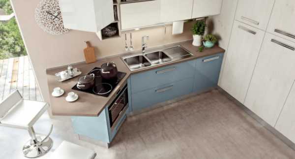 - Г- образная планировка: тумба пристраивается к гарнитуру сбоку. Угловая кухня с полуостровом не подходит для слишком узких комнат;