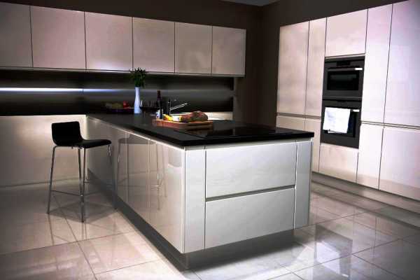Стильный глянцевый чёрно-белый гарнитур с мягкими закруглёнными линиями