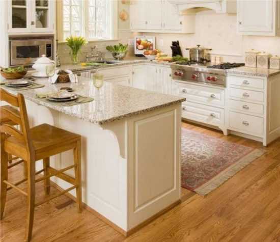 Такая планировка позволяет создать дополнительные места для работы, площадь для хранения продуктов и инвентаря. Кроме того появится место, где могут располагаться члены семьи, а также гости, не мешая процессу приготовления пищи.
