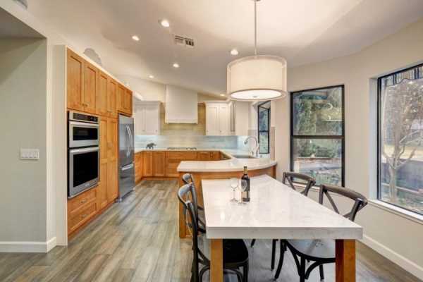 В правой стороне кухни вписался кухонный овальный стол, а в левой части мы наблюдаем как мойку вынесли на полуостров.