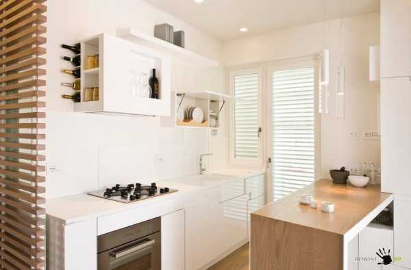 Для совсем небольших кухонных помещений, которые помимо прочего обременены балконной дверью, полуостров становится многофункциональной мебельной системой. Его поверхности можно использовать в качестве разделочного стола, а в последствии – обеденного, внутреннюю часть отдать под небольшие системы хранения.