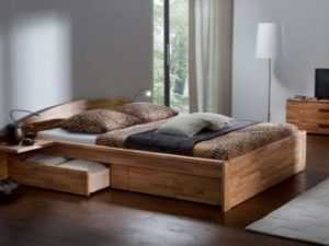 Стандартный размер двуспальной кровати начинается от 160 см в ширину и практически не ограничивается. В продаже можно встретить изделия и в 2,5 м. шириной. При этом необходимо учитывать, что шириной считается ширина матраса, уложенного на основание, а не всех конструктивных элементов самой кровати.