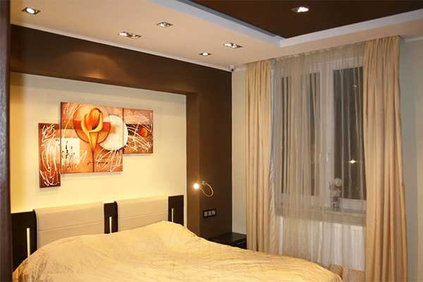 Этот способ размещения картин в спальне, пожалуй, самый сложный. Без опытного специалиста лучше не браться!