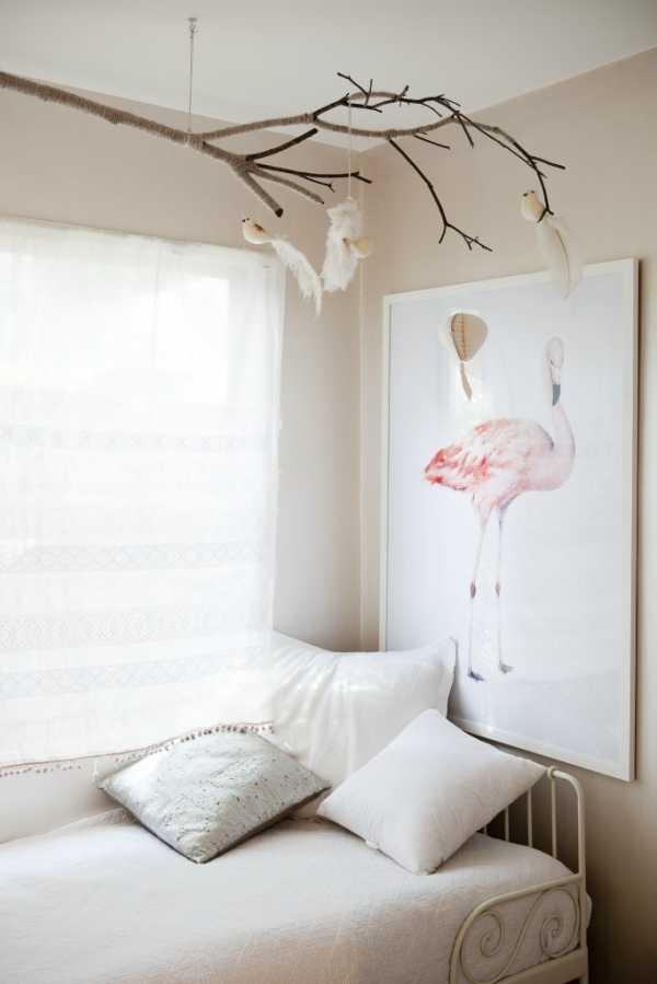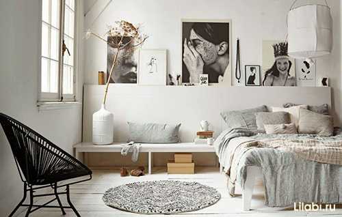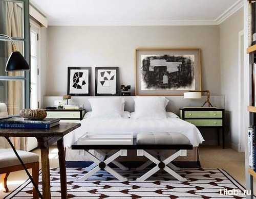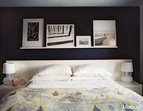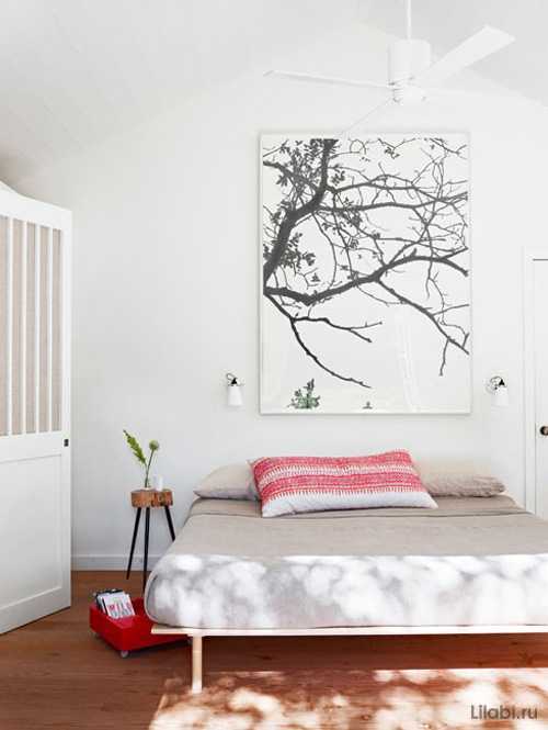 - Картины, художественные фотографии и дизайнерские постеры должно висеть примерно на уровне глаз — слишком высокое их расположение выглядит несколько странно, а слишком низкое утяжеляет спинку кровати.