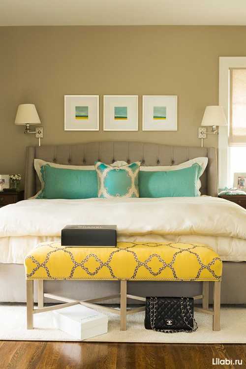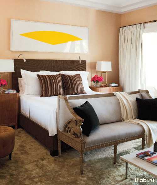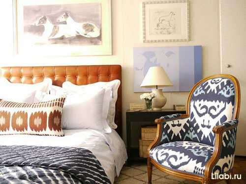 Вполне возможно подобрать картину, выполненную в одном оттенке с покрывалом, креслами, абажуром торшера. Декор изголовья кровати в таком случае получается мягким и ненавязчивым. Правильное освещение поможет выделить акценты в спальне: https://homeli.ru/komnaty/spalnya/osveshchenie-v-spalne.