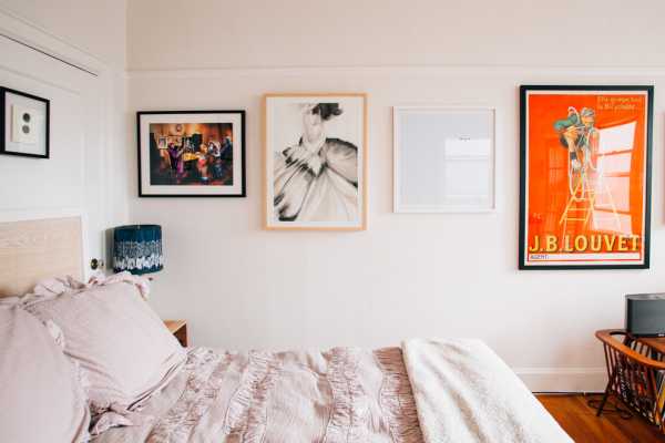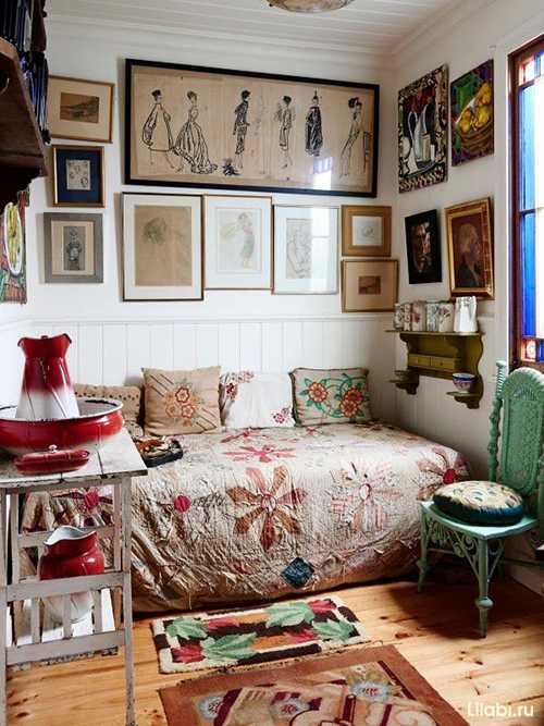 Спальня в бохо-стиле с маленькими масляными картинками, представляющими художественную ценность
