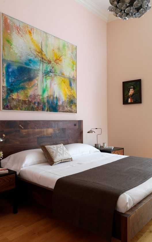 Картина с яркой абстракцией гармонично сочетается с деревянным изголовьем кровати и пастельным цветом стены