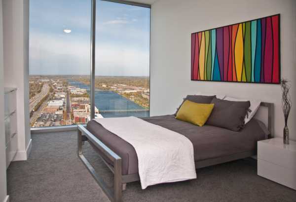 Если помещение выглядит слишком монотонно и скучно, то повесьте яркую картину. Она должна быть достаточно цветной и четко выделяться на фоне общего интерьера. Таким образом, комната приобретает изюминку. Спальня получает цветной акцент и перестанет быть «безликой».