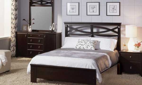 Подобное оформление спальни предполагает наличие разнообразных по форме и размеру картин.