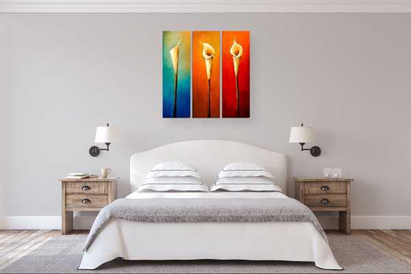 Картины имеют различные сюжеты и при их выборе обязательно нужно обращать внимание не только на сюжет, но и на цвет. Если сюжет на картине универсальный и на ней изображены морские или цветочные мотивы, то вопрос цвета решается строго индивидуально, в зависимости от особенностей интерьера. Картина, расположенная над кроватью в спальне, может повторять и объединять те цвета, которые преобладают в интерьере.