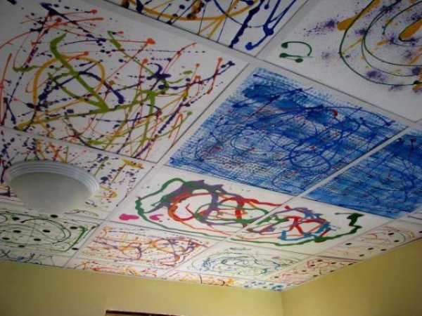 Придать оформлению изюминку можно ничего особенно не переделывая. Достаточно красиво оформить уже имеющееся покрытие. Для этого, можно использовать самые обычные краски, кисти и трафарет. Нанеся на скучный белый потолок рисунок таким способом, можно значительно изменить внешний вид покрытия.