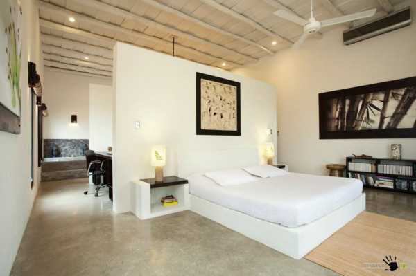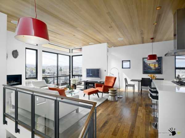 Потолочные перекрытия в виде окрашенных в белый цвет балок, отлично смотрятся в наполненных любовью к минимализму современных помещениях. Подобная стилистика всегда выбирается для просторных и светлых комнат с высокими потолками.