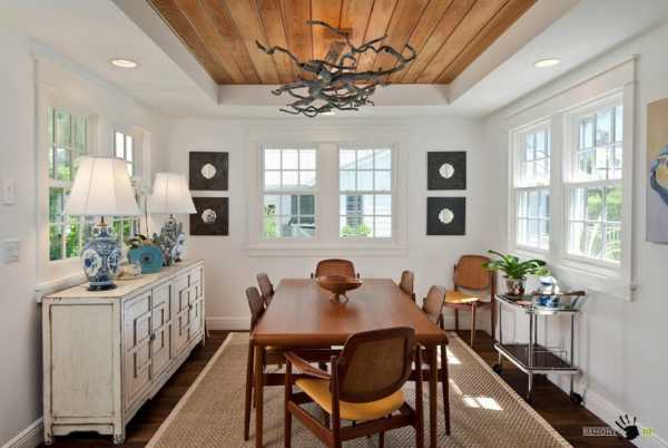 Выделение зоны над обеденной группой с помощью деревянных потолочных панелей позволяет создать гармонию в интерьере столовой загородного дома. Сочетание белоснежных и деревянных поверхностей всегда смотрится выигрышно.