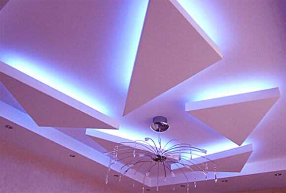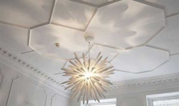 Если дополнить отдельные фигуры, собранные на поверхности перекрытия подсветкой, комната может совершенно преобразиться. Потолок перестанет быть скучным и однообразным. Кроме того, подсветка может быть использована как один из вариантов освещения, что расширяет возможности дизайнера.