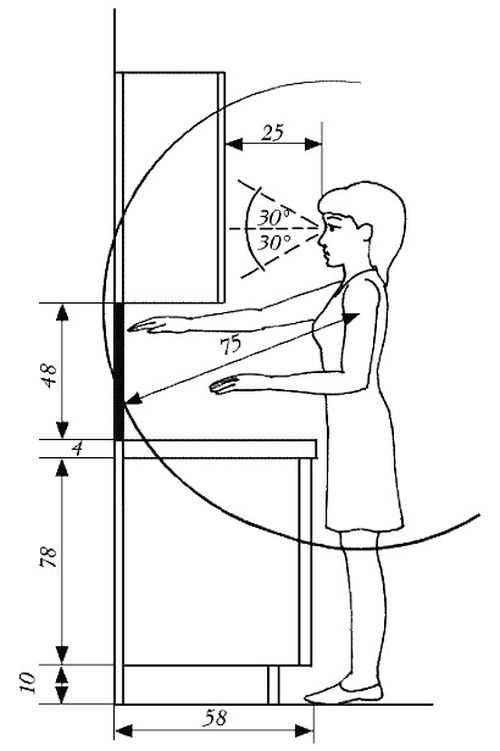 В процессе определения основных параметров нижнего яруса гарнитура учитывается, что человек, работающий на кухне, не должен поднимать руки выше пояса, а иначе будет создаваться дискомфорт в процессе использования помещения по назначению.