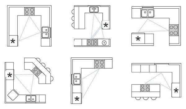 Заранее подготовьте чертежи столов с размерами основных кухонных зон – местом для приготовления еды, мытья посуды, варочной поверхностью. Не забудьте о секции для посуды и продуктов. Оптимальное расстояние зон друг от друга – не более 2,5 метров. Вот шесть вариантов размещения рабочих зон: