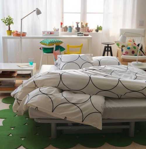 Отдельного внимания заслуживают шерстяные прикроватные коврики с длинным ворсом (шагги). Они невероятно приятны на ощупь, поэтому недаром часто находят место в оформлении детских спален. Ведь на таком коврике приятно не только сидеть, но и играть, и даже дремать. К тому же, объемные ворсистые коврики способны приглушать звуки, создавая в комнате тихую и уютную атмосферу.