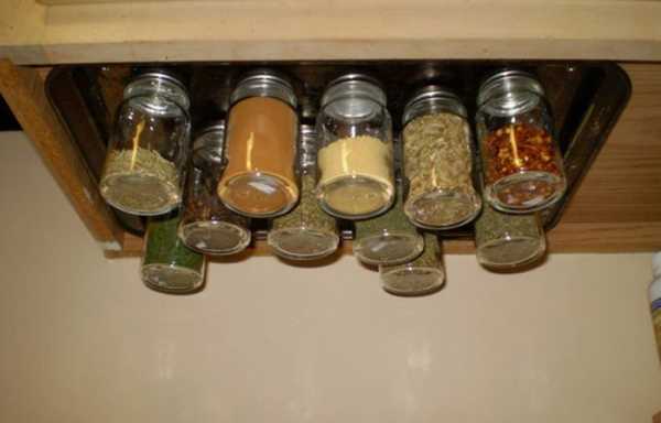 Можно просто расставить их в ряд, а можно использовать магнит, чтобы прикрепить их крышками к оригинальной металлической полочке. Также крышки предварительно прикручиваются саморезами (шурупами) к доске, а затем к этим крышкам можно прикрутить баночку со специями. Причём подойдут баночки любых размеров. Просто и удобно.