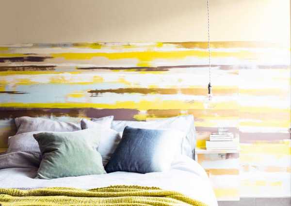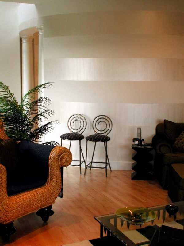 Используя краску двух-трех тонов, можно превратить однотонную стену в полосатую. Стоит сказать, что работа эта очень кропотливая, но результат того стоит.