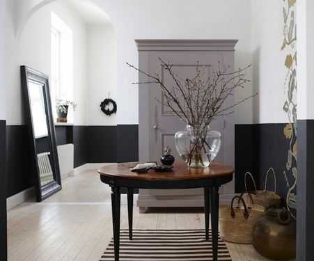 Такая комбинированная покраска стен в два цвета хороша для коридора — горизонтальная полоса визуально снижает его высоту, за счет чего помещение кажется чуть шире и просторнее. Внутри полосы размещают настенный декор — например, небольшие картины или фоторамки. В детской комнате полосу можно украсить рисунками, нанесенными по трафарету.