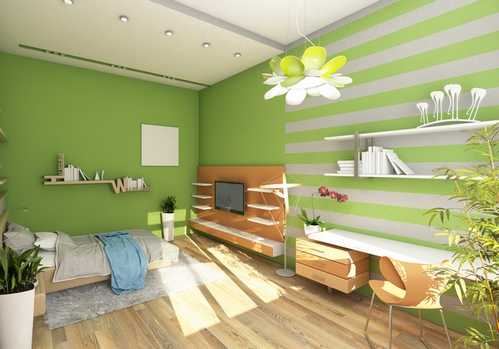 В каком цвете делать интерьер комнаты ребенка подскажет возраст хозяина апартаментов. Малышам больше по душе веселые краски, а вот школьника они будут раздражать. Тут потребуются спокойные зеленые или насыщенные голубые оттенки. Однако сегодня дизайнеры предлагают посмотреть на выбор фонового решения с несколько необычного ракурса и взять за основу детские недостатки. Цвету покраски стен в комнате под силу корректировать детское поведение.