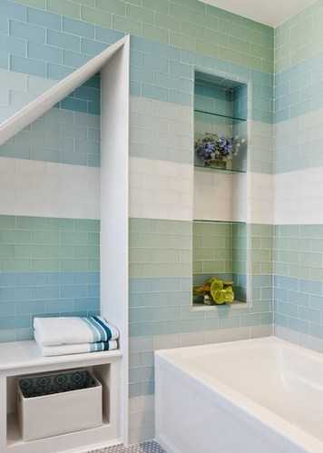 В последнее время на стены чаще кладут прямоугольную плитку. При этом первым с чем приходится определяться — горизонтально или вертикально располагать кафель на стенах. Считается, что горизонтальная раскладка визуально делает помещение шире, а вертикальная — выше. В действительности на цветной, яркой плитке, швы между которыми заделаны затиркой того же или близкого цвета, разница очень незначительна (на фото пара рисунков внизу). В этом случае направление укладки на восприятие почти не влияет. В этом случае выбирать варианты укладки плитки в ванной можно основываясь только на ваших предпочтениях.