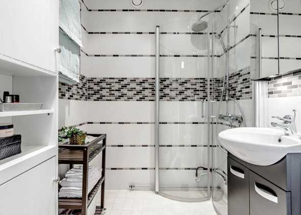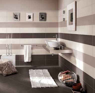 Чтобы расширить помещение или поднять потолок, при подборе раскладки делают вертикальные или горизонтальные «направляющие». Это полосы из кафеля другого цвета, по которым скользит взгляд. Эти полосы изменяют зрительное восприятие размеров помещения.