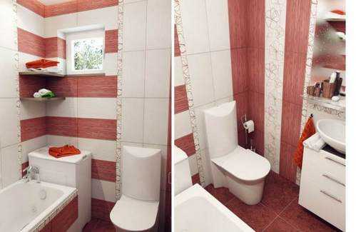 При необходимости сделать потолок визуально выше, при вертикальной раскладке можно на одной из стен (желательно напротив входа) выложить полосу из более светлой плитки. Даже при условии яркой или темной плитки и затирки в тон, потолок «приподнимется». Если же на этой стене использовать кафель более светлого тона, да еще с контрастной затиркой и вертикальной полосой из плитки с орнаментом, эффект будет еще более явным (на рисунке внизу справа).