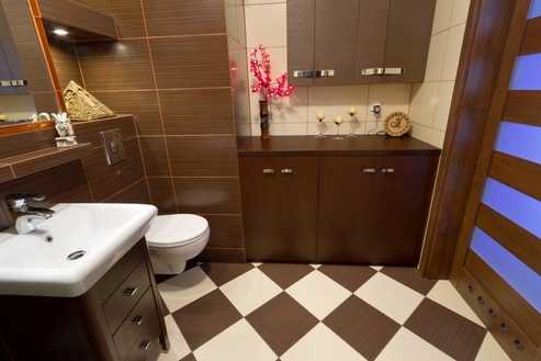 - Полы в этом случае отделываются плиткой этих же цветов, но при этом они могут перемешиваться. Например, отлично будет использовать для пола шахматную раскладку.