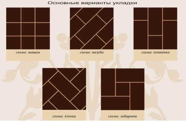 Если выбрана прямоугольная плитка, вариантов раскладки больше — со смещением (палуба, плетенка, елочка).