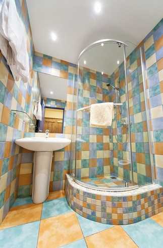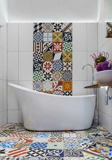 7. «Пэчворк» или «Калейдоскоп». Данный шаблон подразумевает комбинирование плитки несколько цветов, чередующихся хаотично или упорядоченно. Это решение для креативных натур с крепкой нервной системой, легко воспринимающих «творческий беспорядок». Жизнерадостная обстановка в ванной или туалете будет заряжать их позитивной энергетикой и создавать веселое настроение.
