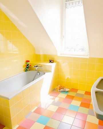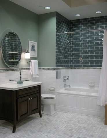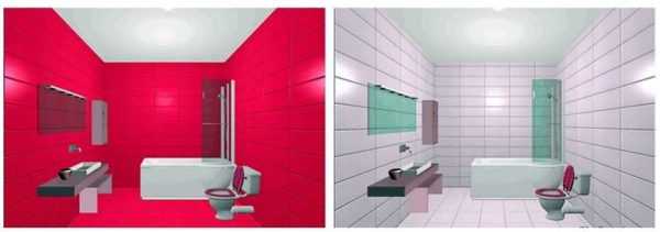 6. Равноправие цветов. По этой схеме два или три основных цвета вводятся примерно равномерно, но не перемешиваются между собой. Одной плиткой отделывается одна половина ванной, другой — вторая и т.д.
