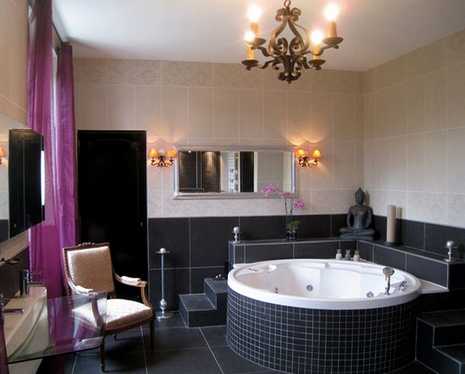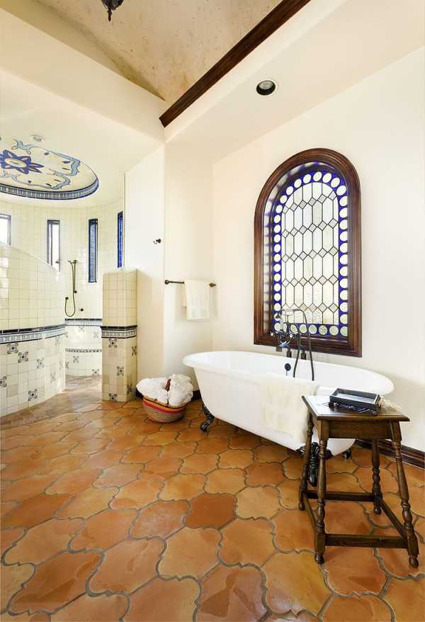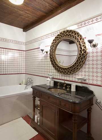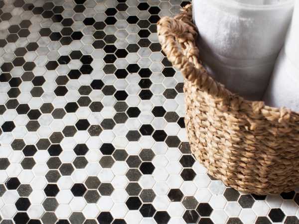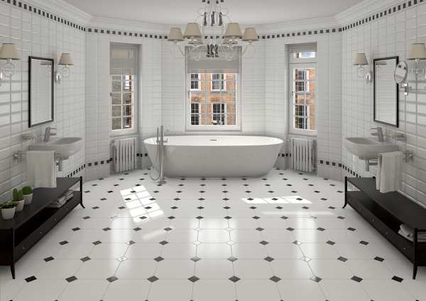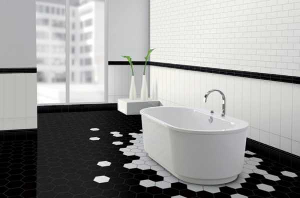 Полы при этом можно облицевать плиткой обоих цветов, расположив их в шахматном порядке или состыковав примерно посередине.