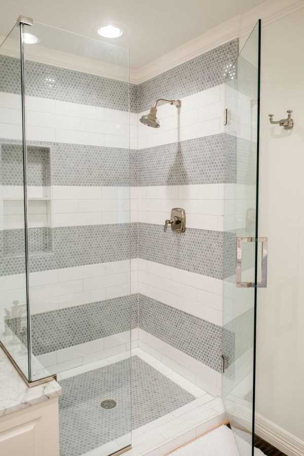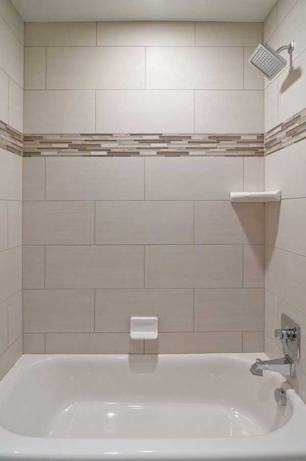 Чтобы этот вариант укладки плитки в ванной смотрелся более современно, можно добавить вертикальные или горизонтальные полосы, которые разобьют монотонное оформление. Многие коллекции предлагают не только более темные и светлые варианты кафеля, но и декор разных размеров, из которых формируют полосы разной ширины.