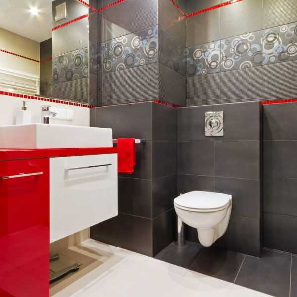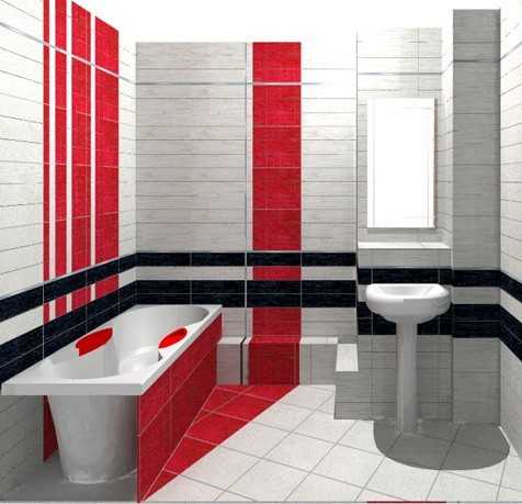 - Таким образом можно визуально четко разделить функциональные зоны в ванной. Например, красным цветом выделить участок у умывальника, а черной плиткой отделать участок возле душевой. Раскладка при этом может быть и горизонтальная, и вертикальная.