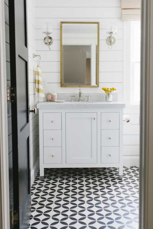4. Пол с «бордюром». Плитка, которой выложен пол, заходит на стену. Другими словами, по низу стены выкладывается полоса, идентичная полу, высотой в одну или две плитки. Простенькая схема, делающая помещение визуально немного шире, но ниже.