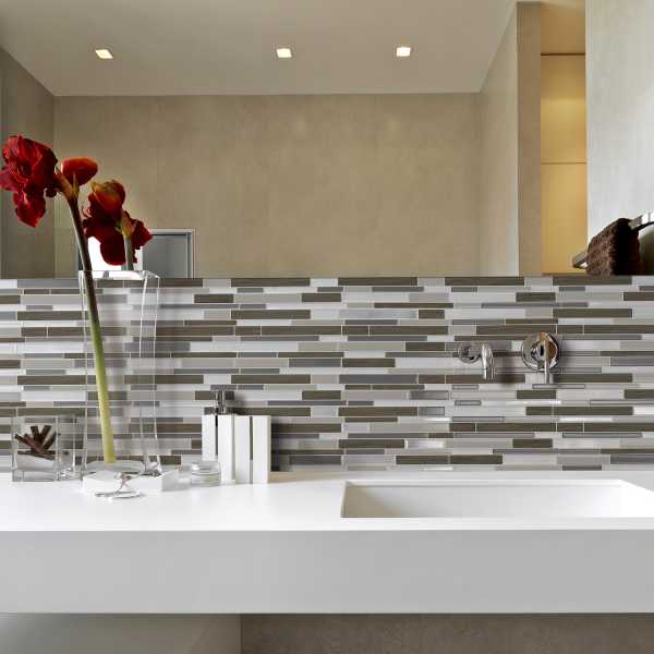 Мозаика отлично смотрится как сама по себе, так и в сочетании с кафелем разного формата — квадратным, прямоугольным, большим и среднего размера. Ее используют при отделке криволинейных поверхностей — благодаря своей структуре она облегает даже колонны небольшого радиуса.