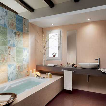 Последние тенденции в дизайне привели к тому, что большая часть кафельной плитки для ванных комнат делают однотонными. Многие коллекции отличаются интересной фактурой, но выполнены в виде однотонных фрагментов. Не всем такое оформление приходится по вкусу — слишком «холодным» получается интерьер. Добавить фантазийности можно при помощи плитки с цветами или бабочками, растительными или геометрическими мотивами.