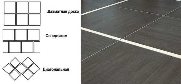 При использовании квадратной плитки обычно укладывают ее в виде шахматной доски (схема шашки), может быть использован способ со смещением на 1/2 плитки. Есть два направления укладки — параллельно стенам и по диагонали.