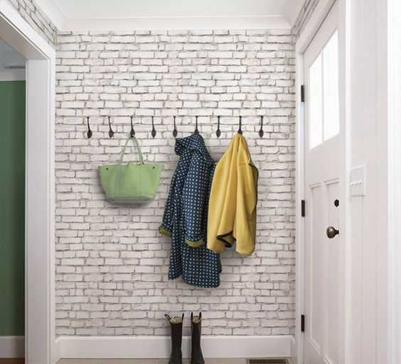Побеленный и нейтральный кирпич отлично подходит для многих стилей, от минимализма до утонченного винтажа. Его главное преимущество заключается в том, что светлые цвета делают любое пространство просторнее, а прихожие часто небольшие. Так что побеленный и светлый кирпич здесь станет и возможностью визуально расширить пространство, и послужить фоном для любого рода картин. Не любите натуральный кирпич – наклейте обои или установите панели под кирпич.